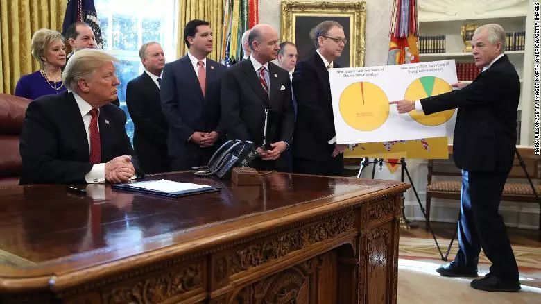 ▲特朗普在白宫椭圆办公室听取彼得·纳瓦罗(右)报告,图/CNN