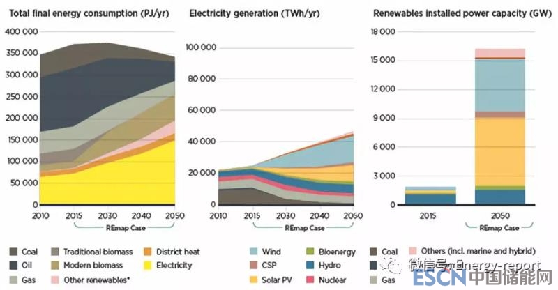 图1.2 国际可再生能源署2050年路线图中能源消费,发电量及可再生能源电力装机容量